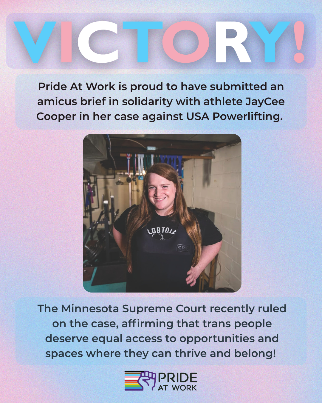 Pride At Work is proud to have submitted an amicus brief in solidarity with athlete JayCee Cooper in her case against USA Powerlifting. The Minnesota Supreme Court recently ruled on the case, affirming that trans people deserve equal access to opportunities and spaces where they can thrive and belong!